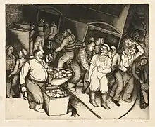 Sarah Berman née Ostrowsky (1895-1957) was a self-taught visual artist.[1] She immigrated from the Ukraine to the United States as a child with her family.[2] Most likely she was part of the large wave of emigration from the Russian Empire at the turn of the century, an exodus that resulted from job and settling restrictions for Jews. While Sarah earned her living in sweatshops in New York City, she taught herself to paint.[2] Although her formal artistic training was limited – she attended life classes with the portraitist Robert Henri at the Anarchist Centre in Harlem and had access to a graphics workshop run under the auspices of Works Progress Administration...".[3] Berman's work was included in the 1940 MoMA show American Color Prints Under $10. The show was organized as a vehicle for bringing affordable fine art prints to the general public.[4] Berman's work was "associated with leftist political circles. She was the founder and operator of the “Tea Room” on the premises of Manhattan’s Rand School with its connections to the Socialist Party of America. Berman portrayed a very different side of New York cultural life than many other female modernists of the period.[3]