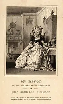 In 1823 Mrs Nicol was engraved as Miss Grizelda Oldbuck by William Home Lizars. She had played that part at the Theatre Royal in an adaptation of Walter Scott's novel The Antiquary.[5]