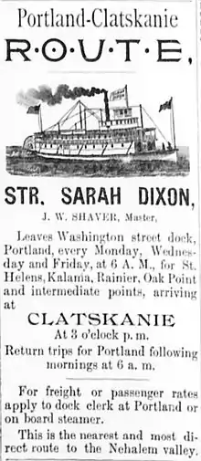 On Wednesday, April 13, 1892, Sarah Dixon made its first trip to Clatskanie, Oregon.[15] Capt. George W. Shaver was at the wheel.[15] As of April 22, 1892, Sarah Dixon was running on the Clatskanie route in place of the G.W. Shaver.[18]