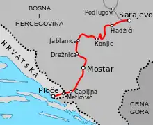 The Sarajevo–Ploče railway is a 194-kilometre (121-mile)[3] long railway in Bosnia and Herzegovina and Croatia. The line connects Sarajevo with Konjic, Mostar and Ploče. The route operates through the regions of Sarajevo Canton, Herzegovina-Neretva Canton and Dubrovnik-Neretva County. The route largely follows the route of the Neretva river.[3] Passenger services along the full length of line have been discontinued between 2013 and 2022, running only between Sarajevo and the town of Čapljina on the Bosnian-Croatian border.[4] International train service between Sarajevo and Ploče resumed on 1 July 2022, on weekends until September 1st, using Spanish-designed Talgo wagons.[5] The line is part of the pan-European corridor 5C from Budapest via Osijek and Sarajevo to Ploče. The section through Bosnia and Herzegovina is marked 11, and through Croatia M304.[6][7]