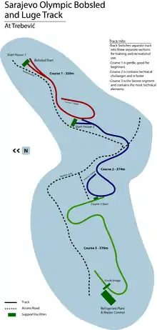 In preparation for the 1984 Winter Olympic Games, Mt. Trebević was selected as the site for a new sliding complex. The track complex was designed by architect Gorazd Bučar,[8] with a vision for both reduced footprint of the facility, and flexible and adaptable use as a piece of Olympic Legacy Infrastructure.[9] The track can be split into three segments for recreational and training purposes.