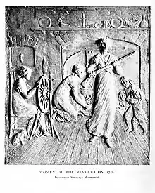 The monument was designed by John C. Markham of New Jersey. The capstone was placed on 3 November 1882, and the bronze statues were completed in August 1887.[1] The statues were designed by George Bissell (Gates), Alexander Doyle (Schuyler), and William O'Donovan (Morgan).[6][7] Markham designed the sixteen bronze bas-relief plaques that line the interior of the first floor.[8]