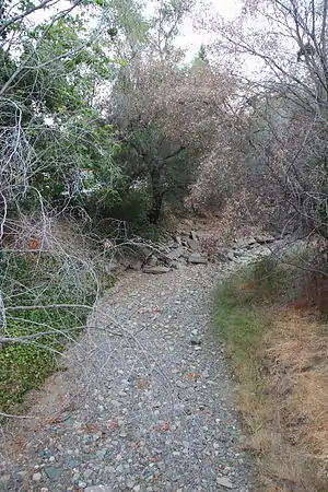 Historically steelhead trout (coastal rainbow trout) (Oncorhyncus mykiss irideus) migrated from San Francisco Bay to spawn in Saratoga Creek and its tributaries. An 1877 report in the Sportsman Gazetteer touted the Congress Springs ("Congress Hall") tributary to San Franciscans for trout fishing.[11] J. O. Snyder reported steelhead trout in Campbell Creek (now Saratoga Creek) in 1905.[12][13] An impassable barrier at the confluence of San Tomas Aquino and Saratoga Creeks prevents salmonid fish passage to both creeks.[14] However, stream resident rainbow trout are still found in Saratoga Creek.[14] Recent genetic analysis has shown that the surviving rainbow trout are of native origin and not hatchery stock.[15]