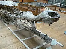 Sarcosuchus is commonly classified as part of the clade Pholidosauridae,[2][11][12] a group of crocodile-like reptiles (Crocodyliformes) related but outside Crocodylia (the clade containing living crocodiles, alligators and gharials).[2] Within this group it is most closely related to the North American genus Terminonaris.[2] Most members of Pholidosauridae had long, slender snouts and they all were aquatic, inhabiting several different environments, some forms are interpreted as marine, capable of tolerating saltwater while others, like Sarcosuchus, were freshwater forms, the most primitive members of the clade, however, were found in coastal settings, zones of mixing of freshwater and marine waters.[12] Sarcosuchus stands out among pholidosaurids for being considered a generalist predator, different from most known members of the clade which were specialized piscivores.[2] A 2019 study found it to be in a more derived position in Tethysuchia, being phylogenetically closer to Dyrosauridae.[13]