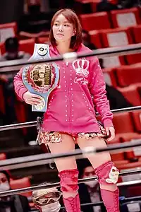 On April 20, 2014, she won her first championship, beating Manami Katsu for the JWP Junior Championship and Princess of Pro-Wrestling Championship.[10] She made one successful defence against Kaho Kobayashi, before dropping the belt to Rabbit Miu on August 17.[11][12] On October 5, she competed in the biggest match of her career to that point, challenging Manami Toyota for the Diana World Championship. After a 20-minute match, Sareee was defeated.[13] On December 23, she and Jaguar Yokota won the Diana Tag Team Championship, beating Kaoru and Mima Shimoda.[14] Sareee and Yokota held the titles until February 2015, when Sareee announced she would be going on an indefinite hiatus due to poor health. She continued competing until April, when she and Yokota successfully defended the belts against Command Bolshoi and Eri, after which, she became inactive and the championships were vacated.[15] After two months away, Sareee returned to the ring on June 28 at Jaguar Yokota's 38th Anniversary Show, teaming with Manami Toyota and Kaoru Ito in a loss to Yumiko Hotta, Mima Shimoda and Meiko Tanaka.[16] On September 16, Sareee had a chance to win the Diana Tag Team Championship back with new partner Meiko Tanaka, but the two were unsuccessful and the vacant titles were won by Dash Chisako and Sendai Sachiko.[17] Despite losing, Sareee and Tanaka became a regular team, and on December 25 defeated Kaho Kobayashi and Rina Yamashita to win Pro Wrestling Wave's Young Oh! Oh! Tag Team Tournament.[18] Two days later at Diana's 40th dojo show, she won a one night tournament, beating Mima Shimoda in the final.[19] On May 5, she main evented Diana's Korakuen Hall show, losing to Seadlinnng's Yoshiko in her 5th anniversary match.[20] The following month, she entered Wave's Catch the Wave tournament, but was eliminated in the quarter final by Tsukasa Fujimoto.[21]