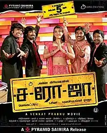 Saroja (stylised as Sa-Ro-Ja) is a 2008 Indian Tamil-language comedy thriller film written and directed by Venkat Prabhu and produced by T. Siva. It stars Shiva, Vaibhav, Premji, S. P. B. Charan, and Vega Tamotia, while Jayaram, Prakash Raj, Sampath Raj, Nikita Thukral, Bose Venkat and Kajal Aggarwal play other vital roles. Several other popular Tamil television artists and crew members make special appearances throughout the film. The score and soundtrack were composed by Yuvan Shankar Raja with cinematography by Sakthi Saravanan.