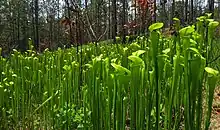 Like all Sarracenia species, Sarracenia alata is native to the New World and grows in permanently wet and open wetlands typically classified as longleaf pine (Pinus palustris) savannas. The Pale pitcher plant's habitat is split into two geographically separate areas: an eastern range from eastern Louisiana across southern Mississippi and into western Alabama and a western range from eastern Texas into western Louisiana.[1] In Mississippi, stands of Sarracenia alata rival in size those of any other Sarracenia species.