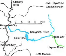 The Sarugaishi River rises in the Kitakami Mountains just south of Mt. Yakushi in Tōno and empties into the Kitakami River in Hanamaki. The Tase Dam is on the Sarugaishi River, in eastern Hanamaki in the former town of Tōwa. This dam was completed in 1953. There is a legend that the entire floodplain of the river in Tōno was once a large lake dammed by the hills in Miyamori.