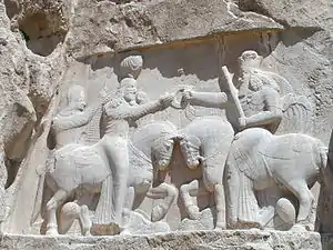 Well below the Achaemenid tombs, near ground level, are rock reliefs with large figures of Sassanian kings, some meeting gods, others in combat. The most famous shows Shapur I on horseback, with the Roman Emperor Valerian bowing to him in submission, and Philip the Arab (an earlier emperor who paid Shapur tribute) holding Shapur's horse, while the dead Emperor Gordian III, killed in battle, lies beneath it (other identifications have been suggested). This commemorates the Battle of Edessa in 260 AD, when Valerian became the only Roman Emperor who was captured as a prisoner of war, a lasting humiliation for the Romans. The placing of these reliefs clearly suggests the Sassanid intention to link themselves with the glories of the earlier Achaemenid Empire.[8] There are three further Achaemenid royal tombs with similar reliefs at Persepolis, one unfinished.[9]