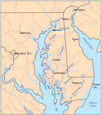 The Sassafras River is a tributary of the Chesapeake Bay on the Delmarva Peninsula in the United States. It is approximately 22 miles (35 km) long[5] and starts in western New Castle County, Delaware, and along the boundary between Cecil County, Maryland on the north and Kent County, Maryland on the south. It rises southwest of Middletown, Delaware and ends at the Chesapeake Bay in a wide mouth between Howell Point near Betterton, Maryland and Grove Point on Grove Neck.