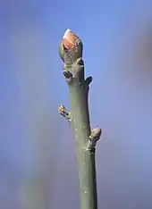 Sassafras albidum is a medium-sized deciduous tree growing to 15–20 m (49–66 ft) tall, with a canopy up to 12 m (39 ft) wide,[7] with a trunk up to 60 cm (24 in) in diameter, and a crown with many slender sympodial branches.[8][9][10] The bark on trunk of mature trees is thick, dark red-brown, and deeply furrowed. The shoots are bright yellow green at first with mucilaginous bark, turning reddish brown, and in two or three years begin to show shallow fissures. The leaves are alternate, green to yellow-green, ovate or obovate, 10–15 cm (4–6 in) long and 5–10 cm (2–4 in) broad[11] with a short, slender, slightly grooved petiole. They come in three different shapes, all of which can be on the same branch; three-lobed leaves, unlobed elliptical leaves, and two-lobed leaves; rarely, there can be more than three lobes. In fall, they turn to shades of yellow, tinged with red. The flowers are produced in loose, drooping, few-flowered racemes up to 5 cm (2 in) long in early spring shortly before the leaves appear; they are yellow to greenish-yellow, with five or six tepals. It is usually dioecious, with male and female flowers on separate trees; male flowers have nine stamens, female flowers with six staminodes (aborted stamens) and a 2–3 mm style on a superior ovary. Pollination is by insects. The fruit is a dark blue-black drupe 1 cm (0.39 in) long containing a single seed, borne on a red fleshy club-shaped pedicel 2 cm (0.79 in) long; it is ripe in late summer, with the seeds dispersed by birds. The cotyledons are thick and fleshy. All parts of the plant are aromatic and spicy. The roots are thick and fleshy, and frequently produce root sprouts which can develop into new trees.[4][5][12]