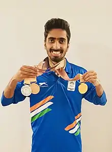 ![]() Sathiyan posing with medals at the 2018 Commonwealth Games in Gold Coast | |