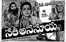 Sati Anasuya is a 1957 Telugu-language Hindu mythological film, based on the life of Anasuya, produced by Sundarlal Nehata under the Rajyasri Productions banner and directed by K. B. Nagabhushanam. It stars N. T. Rama Rao, Anjali Devi, and Jamuna, with music composed by Ghantasala.