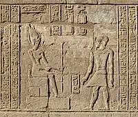 She seems to have originally been paired with the Theban god Montu but later replaced Heket as the consort of Khnum,[9] guardian of the source of the Nile. By Khnum, her child was Anuket, goddess of the Nile. After Khnum was conflated with Ra, she sometimes became an Eye of Ra in place of Hathor.[9][12]