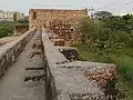 The Satpula across the stream was built as a gate controlled weir. The total length of the structure is 79.5 m (261 ft). It has been constructed in stone masonry. The eleven bays of the weir controlled by sluice gates cover a total length of 54.5 m (179 ft). These eleven bays consist of eleven water tunnels (sluices), each 14.6 m (48 ft) in length, 3.2 m (10 ft) in height, and 2.2–2.9 m (7–10 ft) in width. These are located at different levels, with seven main bays at the lowest level. The balance two additional bays on each bank, on the far east and west sides, are at a higher level. The control arrangements seen now are in the form of gate grooves to operate vertical slide gates. When built, wooden vertical sluice gates made of heavy boards of size 16 cm (1 ft) in thickness, 3 m (10 ft) width, and more than 3 m (10 ft) in height, were operated by a rope and pulley arrangement to control flow of water; the wooden gates have since disintegrated but the gate groves are visible in each bay. The gates of the sluices were closed as a defensive measure against possible attack in the dry season when no storage remained in the dam. Each bay of the weir has an arched opening. On both banks of the weir identical towers (defensive bastions, projecting on the south and north sides) of 5.97 m (20 ft) diameter, but with octagonal shape chambers, are built, which once functioned as madrasa (Islamic school of learning). Hence, the Satpula is also known as "Madarsa".[1][2][4][5] The second level sluice bays on both banks lead to arched corridors. The walls of the octagonal chambers have graceful decorations. The stream tapped by this weir, has been diverted now further east. The indication of the use of the sluices of the structure, either as a dam or for defense purposes, could be gauged from the platforms provided at the appropriate levels. Silt deposition in the storage area of the reservoir side at the southern end is also seen now.[6][7][8]