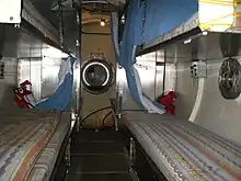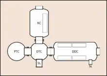 The "saturation system", "saturation complex" or "saturation spread" typically comprises either an underwater habitat or a surface complex made up of a living chamber, transfer chamber and submersible decompression chamber,[36] which is commonly referred to in commercial diving and military diving as the diving bell,[37] PTC (personnel transfer capsule) or SDC (submersible decompression chamber).[1] The system can be permanently placed on a ship or ocean platform, but is more commonly capable of being moved from one vessel to another by crane. To facilitate transportation of the components, it is standard practice to construct the components as units based on the intermodal container system, some of which may be stackable to save deck space. The entire system is managed from a control room ("van"), where depth, chamber atmosphere and other system parameters are monitored and controlled. The diving bell is the elevator or lift that transfers divers from the system to the work site. Typically, it is mated to the system utilizing a removable clamp and is separated from the system tankage bulkhead by a trunking space, a kind of tunnel, through which the divers transfer to and from the bell. At the completion of work or a mission, the saturation diving team is decompressed gradually back to atmospheric pressure by the slow venting of system pressure, at an average of 15 metres (49 ft) to 30 metres (98 ft) per day (schedules vary). Thus the process involves only one ascent, thereby mitigating the time-consuming and comparatively risky process of in-water, staged decompression or sur-D O2 operations normally associated with non-saturation mixed gas diving.[2] More than one living chamber can be linked to the transfer chamber through trunking so that diving teams can be stored at different depths where this is a logistical requirement. An extra chamber can be fitted to transfer personnel into and out of the system while under pressure and to treat divers for decompression sickness if this should be necessary.[38]