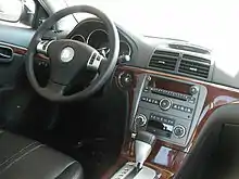 The Aura XR was the top-line Aura model. The XR was fitted with the 3.6 L DOHC V6 with VVT, rated at 252 hp (188 kW) at 6200 rpm and 251 lb⋅ft (340 N⋅m) of torque at 3100 rpm. This engine was first used in the Cadillac CTS as well as the Cadillac STS and marks its third use in a North American GM car. With this 3.6 L engine, the Aura was the first front-wheel drive GM passenger car to use the new Hydra-Matic 6T70 six-speed automatic transmission.[14] The transmission featured TAPshift, which allowed the driver to manually select gears by using paddles located behind the steering wheel.[15] The Aura XR was the performance-oriented version with a taut, but not harsh, suspension and the more powerful engine. Available interior colors in the XR were tan and grey leather (available in the XE), along with the XR-specific black or Morocco Brown leather. Cloth was standard. Other standard features included the Advanced Audio Package, 18 inch alloy wheels, chrome exterior door handles, and remote vehicle start.[16] Given the 2007 Saturn Aura's European roots—the car's chassis was also used for the Saab 9-3. The Aura also used hydraulic power steering (V-6 models only) that provided more feedback and a more linear feel than the fussy electric power-assist units. For 2009, an entry level XR became available. It included the 17 inch 10 spoke alloy wheels available on the XE and the 2.4 L LE5 Ecotec engine mated to GM's all new 6T40 6-speed automatic transmission with TAPshift. The 3.6L VVT with 18" wheels was optional.