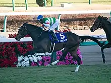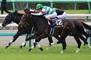Saturnalia moved back to the stable of Katsuhiko Sumii for the 2019 season. For his first run of the season the colt contested the Grade 1 Satsuki Sho, the first leg of the Japanese Triple Crown over 2000 metres at Nakayama on 14 April. In the run-up to the race his assistant trainer Yasuyuki Tsujino said "Things have been fine with him, his breathing's good, and he's run well in training with control and power... He's come along very well, and I don’t think he's been fully extended."[10] Ridden for the first time by Christophe Lemaire he was made the 0.7/1 favourite ahead of Admire Mars in an eighteen-runner field which included Velox, Danon Kingly, Fantasist (Keio Hai Nisai Stakes) and Meisho Tengen (Yayoi Sho). After racing in mid-division in the early stages, Saturnalia moved forward on the final turn and made a strong challenge in the straight taking the lead from Velox 200 metres from the finish. Velox rallied, while Danon Kingly produced a strong run up the inside rail but Saturnalia prevailed by a head and a nose. After the race Lemaire said "I rode him for the first time in the race but I had confidence in him. He seemed a bit nervous and drifted towards the inside when we took command before the crowd. His condition was not 100% as it was his first start this year but he should be in top condition going into the Japanese Derby."[11]