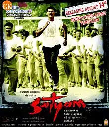 Satyam (transl.Truth) is an Indian 2008 Tamil-language action drama film written and directed by debutante A. Rajasekhar (an associate of Suresh Krissna) in his directorial debut.[2] The film stars Vishal in the role of a cop for the first time. Nayanthara plays the female lead role, while popular Kannada actor Upendra plays the parallel leading role as Vishal's mentor, making his Tamil debut.[3] The film was simultaneously shot in Telugu as Salute, with a slightly different cast and locations. The film's score and soundtrack are composed by Harris Jayaraj. The film released on 14 August 2008.[4] The film was produced by Vikram Krishna, Vishal's brother.