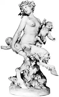 Clodion used the motif in a work which is now in the Walters Art Museum in Baltimore, Maryland: Female Satyr Carrying Two Putti. This satyress is striding upright, carrying a squirming putto in each arm.[4] At least one small terra cotta satyress depicted reclining was created by a student of Clodion in the late 18th or early 19th Century; it resides in a private collection.[5]