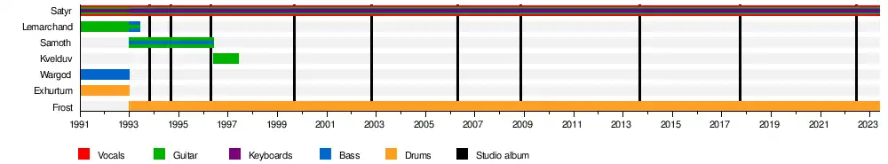 The band were formed in 1990 as Eczema[3] by the bassist Wargod and drummer Exhurtum. In 1991, they decided to start playing black metal and change the band name to Satyricon. Satyr (Sigurd Wongraven) then joined the band. After the first demo All Evil, Exhurtum was kicked out of the band because he "preferred hanging out with my girl at the time rather than kicking down gravestones together with the band",[3] while Wargod left the music scene and became a UN soldier afterwards.[4] Remaining members Satyr and Lemarchand hired the drummer Frost (Kjetil-Vidar Haraldstad) as a session musician and recorded their second and last demo, The Forest Is My Throne. Shortly after this, Lemarchand also left the band. But before leaving the band he recorded guitars (uncredited on the booklet) for the first full-length album, Dark Medieval Times. In the meantime, Frost was being "promoted" as a permanent member and had recorded drums for the aforementioned album. Satyricon have—with two exceptions—been a two-man band ever since: from 1993–1996, Tomas Thormodsæter 'Samoth' Haugen from Emperor was the bassist and guitarist of Satyricon, and participated in the recording of their second album, The Shadowthrone; and later, in 1996, Darkthrone member Nocturno Culto (Ted Skjellum, known as "Kveldulv" during Satyricon's period) became guitarist on the third full-length Satyricon album, Nemesis Divina.