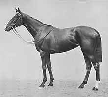 Saucy Sue was a bay mare with a white blaze and one white sock on her left hind foot. She was bred by her owner Waldorf Astor, 2nd Viscount Astor, an American-born politician and newspaper proprietor. Saucy Sue's sire, Swynford, was a successful racehorse and stallion, winning the St Leger Stakes in 1910 and becoming British Champion sire in 1923.[1] Her dam, Good and Gay, was a daughter of Lord Astor's broodmare Popinjay, and therefore a half-sister of the Caulfield Cup winner Magpie. Popinjay's other descendants have included the 2000 Guineas winners Pay Up and Shadeed, the St Leger winners Book Law and Provoke, and the Kentucky Derby and Belmont Stakes winner Swale.[2]