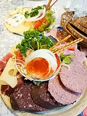 It is served in a variety of ways such as fried with onions atop varenyky, sliced on rye bread, eaten with an egg and mustard sauce, or in "Yayechnia z Kovbosoyu i yarnoyu" a dish of fried kovbasa with red capsicum and scrambled eggs. In Ukraine kovbasa may be roasted in an oven on both sides and stored in ceramic pots with lard. The sausage is often made at home; however it has become increasingly brought at markets and even supermarkets. Kovbasa also tends to accompany "pysanka" (dyed and decorated eggs) as well as the eastern Slavic bread, paska in Ukrainian baskets at Easter time and is blessed by the priest with holy water before being consumed.[37]