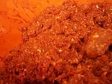 A variety of fresh meats may be used for making sausage, the most common are from beef, pork, lamb, chicken, turkey, and game.[5] Meat should be fresh, high quality, have the proper lean-to-fat ratio and good binding qualities. The meat should not be contaminated with bacteria or other microorganisms. Combining spices and seasonings in amounts that complement each other is important.[1]