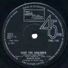 "Save the Children" is a 1971 song written by Al Cleveland, Renaldo Benson and Marvin Gaye and issued on Marvin's 1971 album, What's Going On. While not issued as a single in the United States, the song was issued as a single by the Tamla-Motown label in the United Kingdom where it peaked at No. 41 on the charts in December 1971, whereas the other major US single releases initially failed to chart in Europe.[1]