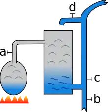 On 2 July 1698 Savery patented a steam-powered pump, "A new invention for raising of water and occasioning motion to all sorts of mill work by the impellent force of fire, which will be of great use and advantage for draining mines, serving towns with water, and for the working of all sorts of mills where they have not the benefit of water nor constant winds."[3] It was referred to as the "Savery engine", although it is not technically an engine. He demonstrated it to the Royal Society on 14 June 1699. The patent had no illustrations or even description, but in 1702 Savery described the machine in his book The Miner's Friend; or, An Engine to Raise Water by Fire,[4] in which he claimed that it could pump water out of mines.