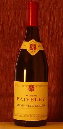 Savigny-lès-Beaune wine is produced in the commune of Savigny-lès-Beaune in Côte de Beaune of Burgundy. The Appellation d'origine contrôlée (AOC) Savigny-lès-Beaune may be used for red and white wine with respectively Pinot noir and Chardonnay as the main grape variety. The name of the appellation is sometimes written simply as Savigny, without the -lès-Beaune suffix. The production consists of slightly over 85 per cent red wine, and slightly less than 15 per cent white wine. There are no Grand Cru vineyards within Savigny-lès-Beaune.