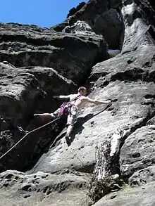 The main means of protection are slings which are tied around natural features or threaded through natural holes in the rock.[2] Knotted slings can be firmly placed within cracks, functioning similar to a camming device.[3] Any form of metal protection such as nuts, cams or pitons are forbidden to use as they may damage the rock.