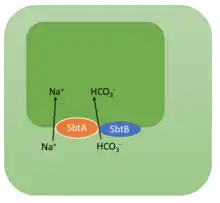 SbtB is part of the cyanobacterial CCM (CO2-concentrating mechanism) system.[11] It acts as a post-translational regulator (inhibitor) of the SbtA protein (one of the three sodium-dependant bicarbonate (Na+/HCO3−) symporters in the cytoplasmic membrane) by binding to it during the dark hours to prevent rising levels of Na+ from growing and becoming toxic for the cyanobacterial cell.[19] The SbtB protein is crucial for the photosynthetic process as it inhibits the SbtbA protein via direct interaction between both proteins. It is therefore a regulator of the Na+/HCO3− transporter[11] and is responsible for the cyanobacterial inorganic carbon response via cAMP sensing.[2]