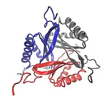 A crystallographic structure of SbtB protein has been obtained from ScSbtB (Synechocystis sp.[2]) The apo-ScSbtB shows a canonical ferredoxin-like fold in every subunit. As seen before, the molecular structure of the three subunits is identical. At the N terminus the first beta-sheets face the C terminus. The carboxyl terminus of the last cysteine forms a hydrogen bond with the N terminus. This interaction allows the stabilization of N and C terminus.[2]