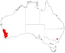It is found in the IBRA Regions of the Avon Wheatbelt, the Geraldton Sandplains, the Jarrah Forest, and the Swan Coastal Plain., or (using Beard's provinces) in the South-West Province[4]