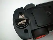 Scalextric is controlled with a hand-held plunger, connected by wire to a connector on the set. A set normally has two to six plungers included. Mounted in the track (for each lane) are two metal rails, which for Analogue carry the DC current from the controllers, or for Digital have constant AC current passed through them, in either case picked up by two metal braids or plates on the underside of the racing cars.[6][7]