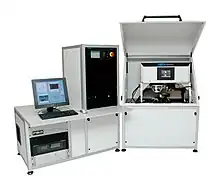 A high temperature Scanning SQUID Microscope using a YBCO SQUID is capable of measuring magnetic fields as small as 20 pT (about 2 million times weaker than the earth's magnetic field). The SQUID sensor is sensitive enough that it can detect a wire even if it is carrying only 10 nA of current at a distance of 100 µm from the SQUID sensor with 1 second averaging. The microscope uses a patented design to allow the sample under investigation to be at room temperature and in air while the SQUID sensor is under vacuum and cooled to less than 80 K using a cryo cooler. No Liquid Nitrogen is used. During non-contact, non-destructive imaging of room temperature samples in air, the system achieves a raw, unprocessed spatial resolution equal to the distance separating the sensor from the current or the effective size of the sensor, whichever is larger. To best locate a wire short in a buried layer, however, a Fast Fourier Transform (FFT) back-evolution technique can be used to transform the magnetic field image into an equivalent map of the current in an integrated circuit or printed wiring board.[4][5] The resulting current map can then be compared to a circuit diagram to determine the fault location. With this post-processing of a magnetic image and the low noise present in SQUID images, it is possible to enhance the spatial resolution by factors of 5 or more over the near-field limited magnetic image. The system's output is displayed as a false-color image of magnetic field strength or current magnitude (after processing) versus position on the sample. After processing to obtain current magnitude, this microscope has been successful at locating shorts in conductors to within ±16 µm at a sensor-current distance of 150 µm.[6]