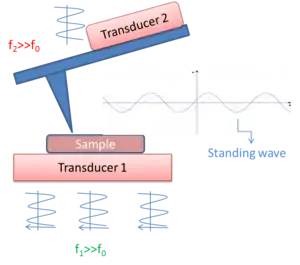 Scanning near-field ultrasound holography combines atomic force acoustic microscopy and ultrasonic force microscopy. Two transducers producing high frequencies are used. Usually frequency is higher than the resonant frequency of the cantilever. One transducer is placed below the sample and the other attached to the cantilever. The cantilever can be called as SPM acoustic antenna which senses the interference of acoustic waves sent by the transducers. The interference of these waves forms surface acoustic standing waves. The wave's frequencies are slightly different. The perturbations to phase and amplitude of the surface acoustic standing wave are locally monitored by the antenna via the lock-in approach and the SPM electronic module. This electronic module was developed by Shekhawat and Dravid. It was implemented with a radio frequency (RF) lock in approach.