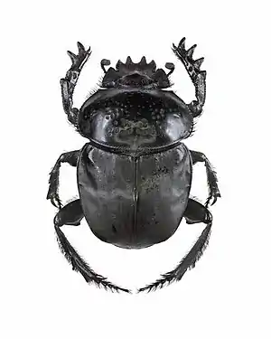 Scarabiasis, or "beetle-disease", is a condition where beetles temporarily infest the digestive tract of other animals. It can also affect humans, and despite being a rare phenomenon,[1] it is the second most important insectal disease in humans after myiasis, which is caused by the larva of flies. The term is commonly used as a synonym of canthariasis, but the latter refers to the infection of animal tissues by beetle larva, whereas the Scarabiasis refers to the infection by adult beetles. Moreover, Scarabiasis refers to the passing of live beetles in animal faeces.[2] Reported symptoms of scarabiasis include loss of appetite, diarrhea, abdominal cramps, vomiting, nausea, and insects in stool. Scarabiasis has been known to infect the gastrointestinal tract, urogenital system, nasal sinuses, ears, and faces of mammals and other animals.[3]