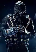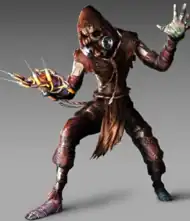 - Scarecrow returns in Batman: Arkham Knight (2015),[31][32] having aligned himself with the titular Arkham Knight, Simon Stagg, and several of Gotham City's supervillains in an attempt to kill Batman.[33] After being mauled by Killer Croc and surgically reconstructing his disfigured face to resemble his mask, Scarecrow forces the civilian evacuation of Gotham by threatening to unleash his new, more potent strain of fear toxin on Halloween, allowing the Knight's militia to occupy the city.[34] Over the course of the game, he manufactures the toxin at Ace Chemicals in an attempt to cover the Eastern Seaboard with fear gas, kidnaps Barbara Gordon, and betrays Stagg to seize control of his "Cloudburst" device to spread his toxin across Gotham, only to be thwarted by Batman while Poison Ivy sacrifices herself to reverse the toxin's effects. Following the Arkham Knight's defeat, his militia defect to Scarecrow, who tries to force Commissioner Jim Gordon to kill Batman in exchange for Barbara's life. While Batman rescues her, the militia kidnap Jim and Robin to force Batman to surrender at Arkham Asylum. Scarecrow unmasks Batman as Bruce Wayne on live television before injecting him with fear toxin,[35] but Batman overcomes his fears once more and subdues Scarecrow with his own toxin, after which he is taken into GCPD custody.[36]