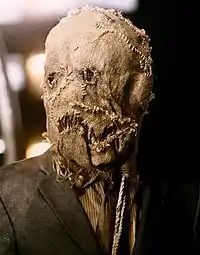 The Scarecrow appears in Christopher Nolan's The Dark Knight Trilogy, portrayed by Cillian Murphy, and is the only villain to appear in all three films. This version wears a burlap sack with a built-in rebreather that doubles as a gas mask for his fear experiments. Murphy explained that the relatively simple mask, as opposed to the full scarecrow costume seen in the comics, was utilized because he "wanted the Scarecrow to avoid the Worzel Gummidge look, because he's not a very physically imposing man—he's more interested in the manipulation of the mind and what that can do".[10]