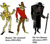 - Scarecrow returns in The New Batman Adventures, voiced by Jeffrey Combs in the episode "Never Fear" and by an uncredited Jeff Bennett in the episode "Over the Edge". For this series, he sports a "darker" design resembling a cross between a corpse and a Western preacher with a noose around his neck. Series co-creator Bruce Timm described Scarecrow's new outfit as a "Texas Chainsaw Massacre Leatherface kind of look. It really had nothing to do with being a scarecrow per se, but he was definitely scary", while fellow co-creator Paul Dini commented that "[Scarecrow] looked like a hanged man who had been cut down and gone off to terrorize people. We weren't even sure if there was an actual guy in the suit."[6] Throughout his appearances, he creates a new strain of fear toxin that eliminates fear and makes its victims dangerously reckless as well as infects Batgirl with his fear toxin, causing her to have a nightmarish hallucination in which she is killed by him and a vendetta erupts between Batman and her father, Commissioner Gordon.