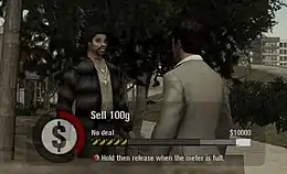 "Cop heat" and "gang heat" are two meters which are active at all times during the game. Cop heat determines the rate of interest at banks, and gang heat determines the price of cocaine; the more heat, the less Tony can charge. If Tony, or any of his associates, engages in a lot of public violence, cop heat will rise, and the police will arrive, pursuing Tony. Cop heat can be lowered with bribes, and gang heat can be lowered by intimidating other gangs.[9] If Tony continues to commit crimes in public, cop heat can rise to the point where he enters "You're fucked" mode, in which he cannot escape from the police alive.[18] A "golf swing"-style minigame, where the player must attempt to stop the meter in a certain zone, is used to control negotiating drug deals, intimidating other gangs, and bribing cops.[19]
