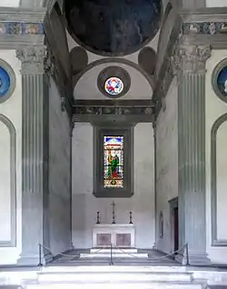 A scarsella can be seen in the Baptistery of Florence which, initially built octagonal, was then equipped with a smaller rectangular construction attached to the original building. Another medieval scarsella is that of the Cappellone degli Spagnoli in Santa Maria Novella, also in Florence, which served as a model for Filippo Brunelleschi to design the plans of the Sagrestia Vecchia of San Lorenzo and of the Pazzi Chapel.[3] Brunelleschi studied a model of the chapel in which the base was square and the scarsella opened in the center of one of the walls, with the side dimension equal to one third of the chapel and with an area equal, therefore, to a one ninth of the entire chapel area. This scheme proved to be successful and was actively used by the great architects of the Renaissance, especially for centrally-planned buildings.[4] An early example of a monumental scale is the Basilica of Santa Maria delle Carceri in Prato designed by Giuliano da Sangallo in which the presbyteral area composes a sort of a large bag. Another example of a scarsella is the apse of the church of Santa Maria dei Miracoli in Venice.