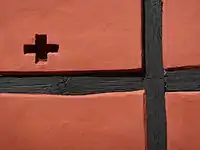 The western gable is extended with a one-storey barn, also in timber framing but with dressed fillings and cross-shaped ventilation holes towards the street. To the north, there is a one-bay, two-storey extension, dating from 1857, also in timber framing, where the current main entrance is found.