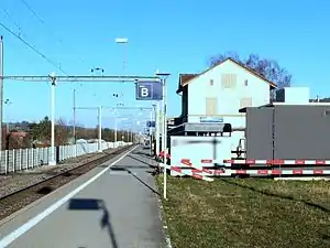 Schöfflisdorf-Oberweningen railway station is a railway station in the municipalities of Schöfflisdorf in the Swiss canton of Zurich. The station takes its name from the adjoining municipalities of Schöfflisdorf and Oberweningen. It is located on the Wehntal railway line, and is served by Zurich S-Bahn line S15.[5][2][1] The old station building from the Swiss Northeastern Railway is still standing, but is disused. A waiting room and bike racks are from 1990 when the Zurich S-Bahn was inaugurated. In the front of the station is the turning loop for the bus line 555 connecting Oberweningen and Schleinikon to the station. The bus line is only operating Monday through Friday during peak hours.