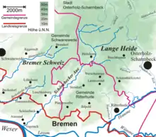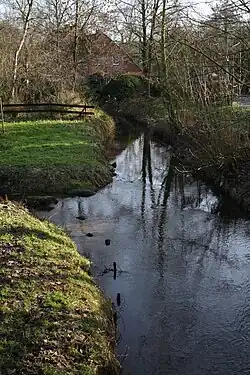 The Schönebecker Aue's total length is 17.7 km (11.0 mi), of which the last 3.1 km (1.9 mi) are in the city of Bremen.[2] The stream's source is on the Lange Heide, a geest plateau north of Bremen in Osterholz-Scharmbeck, which is also the source of several other geest streams (e.g.: the Drepte, Giehler Bach, Scharmbecker Bach and Wienbeck).