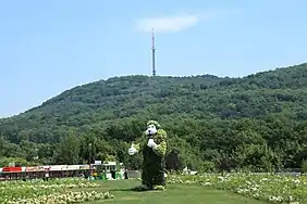 The story of a rock formation used for the calendrical observation of the sun has been passed down from a prehistoric period. This rock formation is known today as the Geldkeller ("money cellar") and serves as the basis for several legends.[3] In addition, there are the remains of an approximately 3000-year-old ring wall on the mountain, which once served to protect a Bronze Age settlement.[4] For centuries the hill was used as pasture for cattle and sheep, which is why it is also known as the Schafberg. Due to the fact that the hill has only a few springs, keeping livestock was difficult. One of the few places where water could be found on the hill was the spring of Rinnelbrunnen, which was used as a drinking trough.[5] After 1850, keepign animals on the hill was no longer allowed. From 1936 there was an ammunition store at the Löbau barracks at the foot of the hill , which was cleared after 1990. During the Second World War there was an anti-aircraft observation tower on the summit.[6]