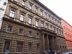 Prior to the construction of the current Palace, the building lot was occupied by an orphanage. It was sold to two railway magnates, Jan Schebek and František Ringhoffer, in 1868.[3][4] Jan Schebek then commissioned architect Vojtěch Ignác Ullmann to design the current building. Ullmann's designs were inspired by renaissance Rome, and the building was constructed between 1870 and 1872. Originally designed to be three stories tall, additional floors have been added since the original construction. The building has four wings, with a rectangular courtyard in its center. Of special note are its ceiling murals by Viktor Barvitius, sculptures by Josef Wagner, and the building's marble staircase which leads to the first floor's main reception rooms.[5]