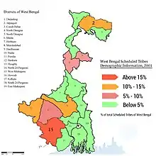 As per 2001 census scheduled tribes numbering 4,406,794 persons constituted 5.5 per cent of the total population of the state. Santals constitute more than half (51.8 per cent) of the total ST population of the state. Oraons (14 per cent), Mundas (7.8 per cent), Bhumij (7.6 per cent) and Kora (3.2 per cent) are the other major STs having sizeable population. Along with Santal, they constitute nearly 85 per cent of the state's total ST population. The Lodhas, Mahalis, Bhutias, Bedias, and Savars are the remaining STs, and having population of one per cent or more as per 2001 census report.[3] After 2002 the population of ST had increased due to addition of major groups Tamang & Limbu(Subba) has great significant number in the population.[4]